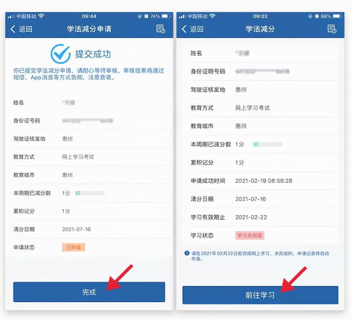 4、点击【完成】,系统审核通过后,返回业务中心,点击【学法减分】,进入学习界面,信息确认无误后点击【前往学习】,阅读学习须知后需进行实人认证。