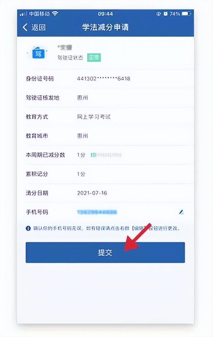 3、查看提交界面信息,若手机号码有误的,可跳转至修改手机号码界面进行修改,若无误,点击【提交】。