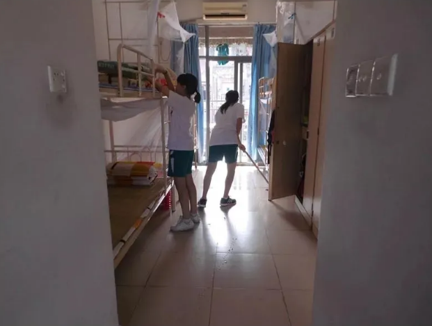 ● 女生宿舍比男生宿舍略显宽敞,女生的宿舍高12层,设有两个电梯,住着初中和高中的全体女生,也是每间住5人,室内实施与男生一样,比男生宿舍略显宽敞,阳台有一厕所及一冲凉房。