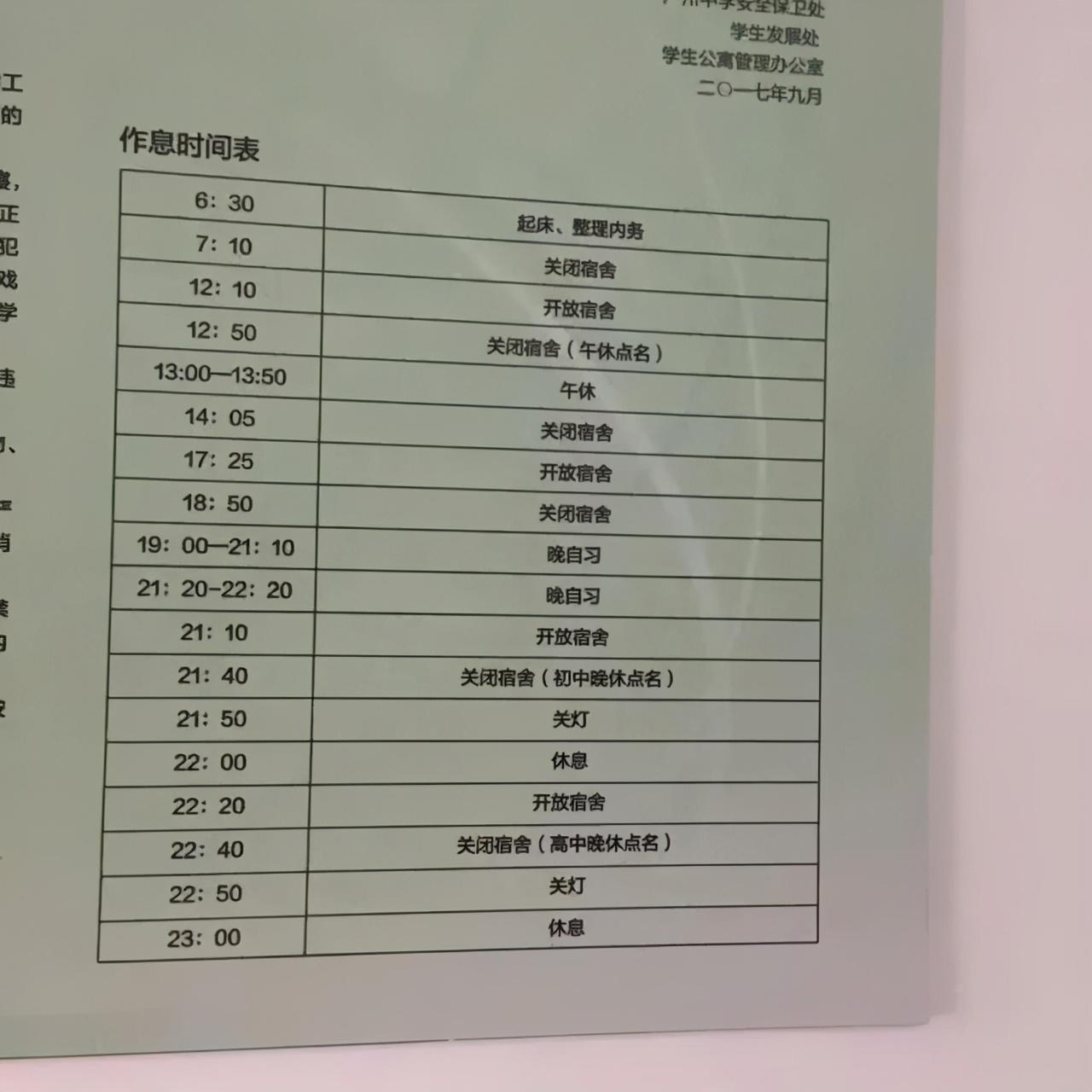 【宿舍条件】每个宿舍目前住6-7人,宿舍有2个洗手间和浴室。宿舍每人值日,有明确的卫生要求标准,每天三次检查。