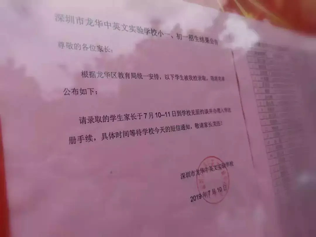 杨女士家住龙华,她的小孩今年正准备读初一,前两天杨女士收到了教育部门发来的通知,她的小孩被龙华中英文实验学校录取了。