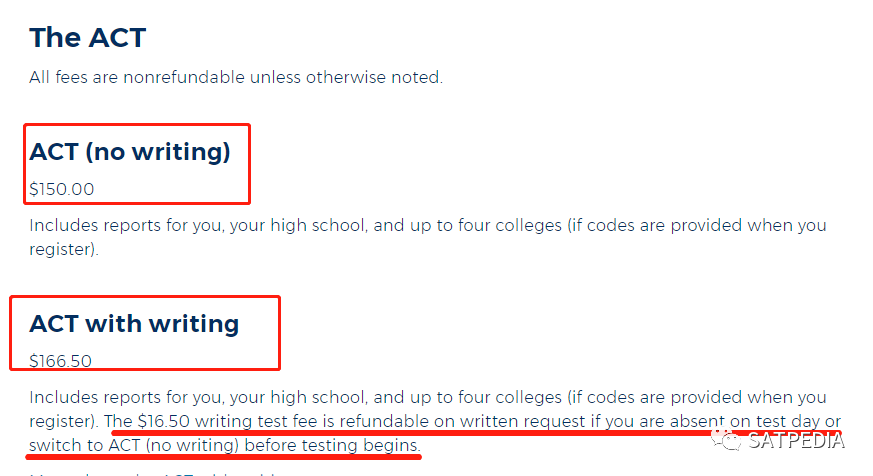 如果你不想考,只有写作费用可以退。申请方式:邮件发送至myact@act.org,主题栏:REFUND。内容包括:你的个人信息,注册的考试日期,以及考试可选项(如写作)。退款大概需要8周返还。