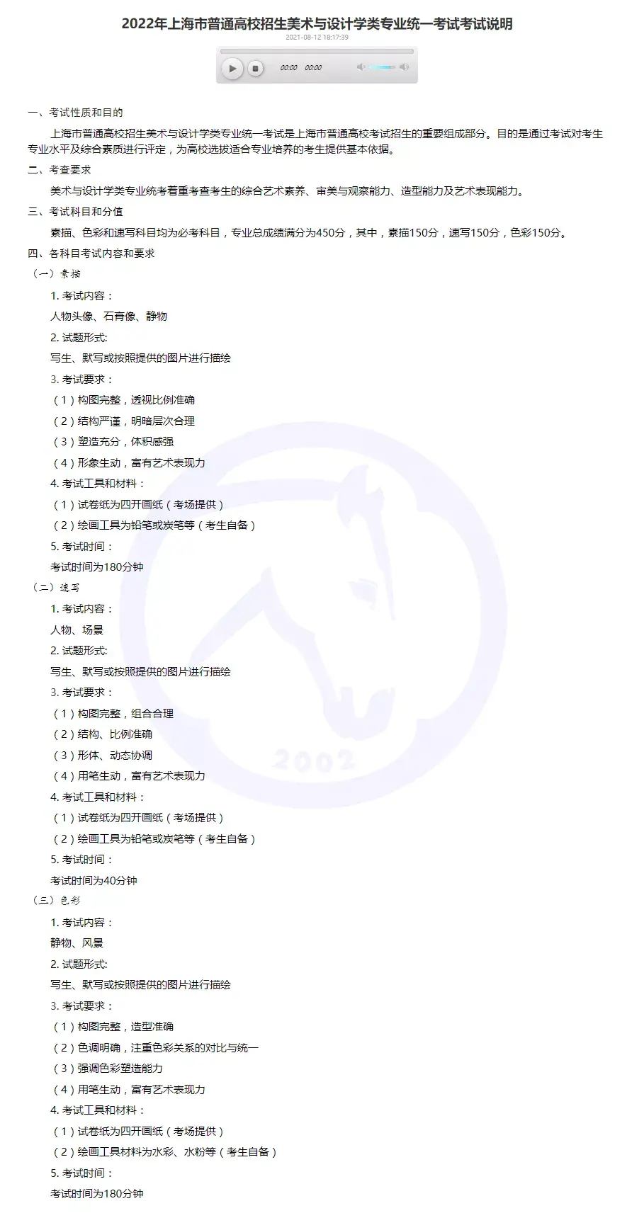 上海市已发布2022年音乐学类、编导类、播音与主持艺术类、表演类、美术与设计学类考试说明