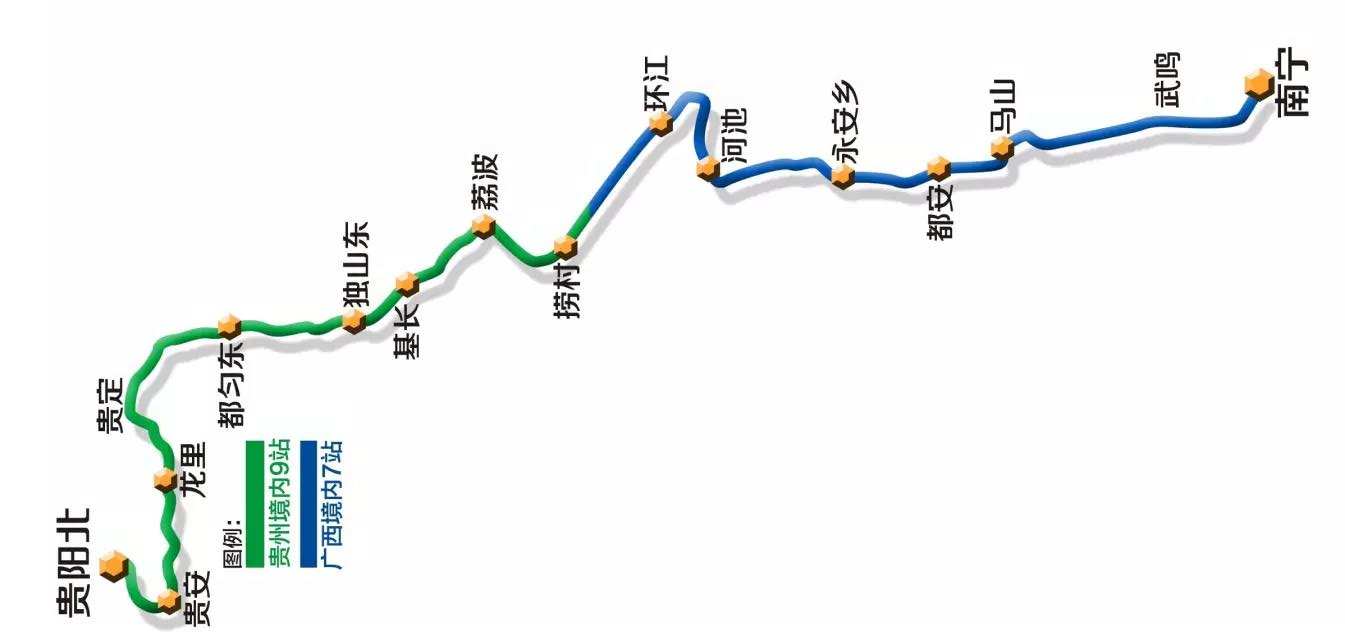 贵南高铁北起贵州省贵阳,向南经贵州省龙里、都匀、独山、荔波和广西壮族自治区金城江、都安、马山、武鸣,止于广西南宁,正线全长482.6公里,其中贵州境内199.6公里、广西境内283公里。桥隧比超九成,穿越毛南族、瑶族、布依族等30多个少数民族聚居区,是国家“十三五”交通扶贫16个重点铁路项目之一。