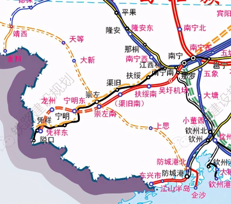 在官方发布的广西“十四五”铁路建设规划示意图上:黑色为既有铁路、蓝色是“十四五”开工并建成的铁路、红色为“十四五”续建的铁路、绿色为“十四五”跨“十五五”铁路。