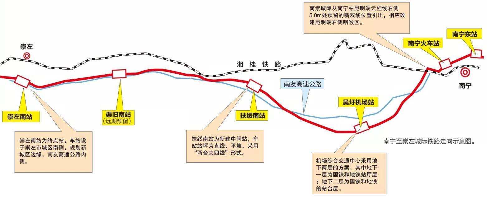 线路东起南宁站,设吴圩机场站、扶绥南站、渠旧站,至崇左南站。按计划,这条铁路将于2022年建成开通。届时,南宁至崇左运行时间将从2小时以上缩短至30多分钟,并且铁路途经南宁吴圩国际机场,南宁站、南宁东站将实现与南宁吴圩国际机场动车直通,飞机与高铁无缝换乘将成为现实。
