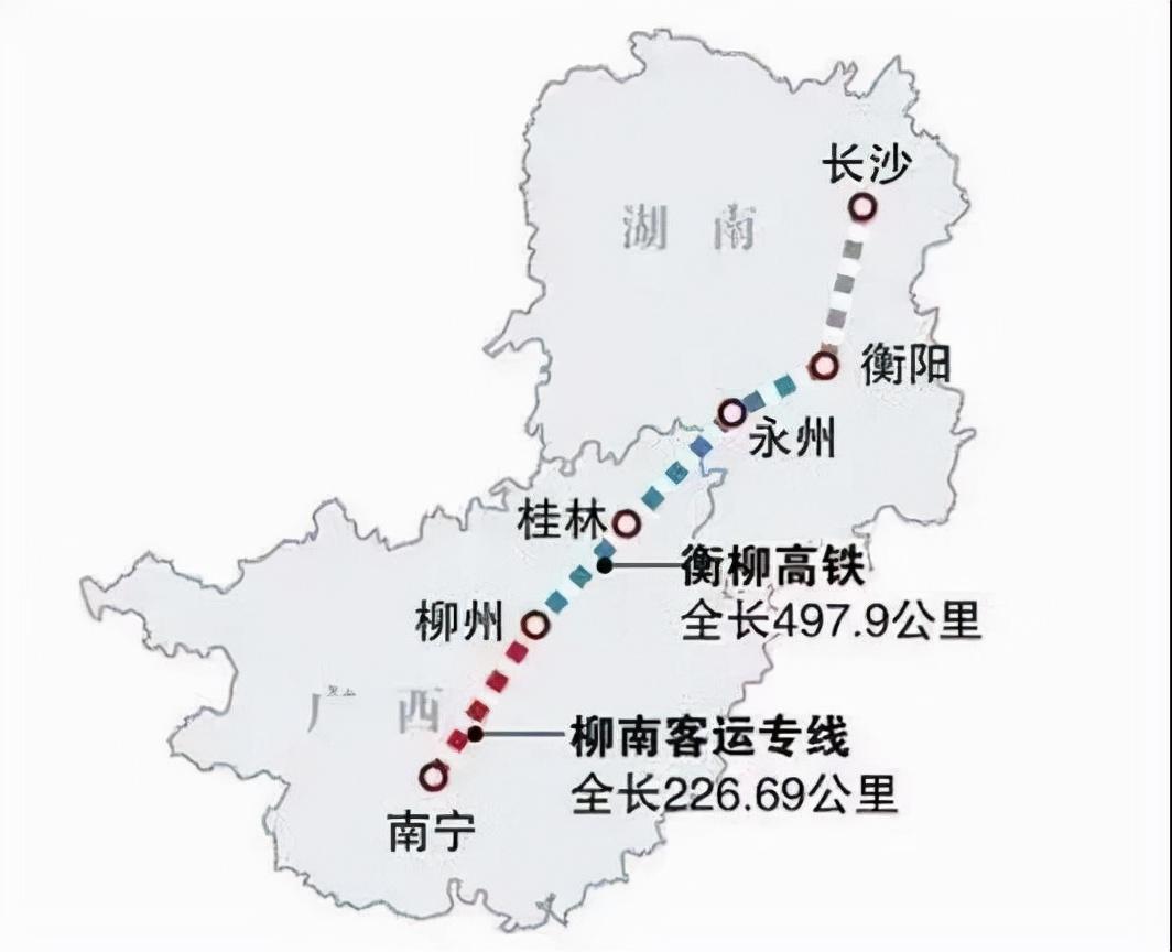衡柳高铁北起湖南省衡阳市,南至广西柳州市,于 2012年全线建成通车,设计时速200公里/小时,预留250公里/小时条件,高铁正线全长497.9公里。衡柳高铁提速至250公里/小时,提速后衡阳至桂林旅行时间可缩短30分钟,至柳州可缩短71分钟,至南宁可缩短85分钟,客流密度相比提速前可增加20%。