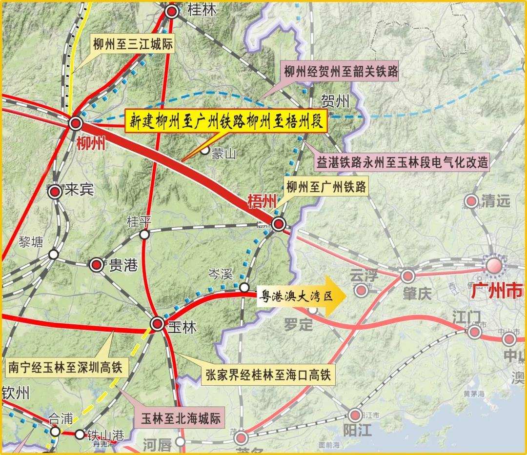 “十四五”跨“十五五”铁路:南昆铁路百色至威舍段增建二线、云桂沿边铁路、黔桂铁路增建二线、南宁经桂林至衡阳新高铁、湘桂铁路衡柳段普速线扩能改造、柳州经贺州至韶关铁路、贺州至梧州城际铁路、梧州至玉林(岑溪)城际铁路、柳州经梧州至广州铁路梧州至广州段、益湛铁路永州至玉林段扩能改造、贵港至玉林高速铁路、湘桂铁路南宁至凭祥段扩能改造、玉林至北海(合浦)城际铁路、岑溪至茂名高速铁路。(见下篇文章:《广西将修建34条铁路,这14条选入远期规划》