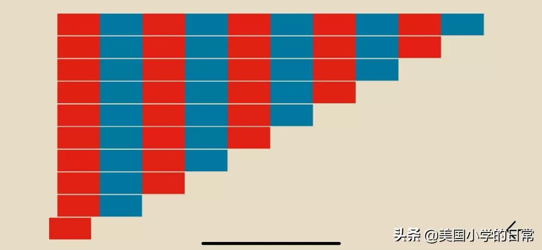 例如下面的红蓝数棒练习,这是蒙氏教育中的典型教具,让孩子先通过比较长短,然后对数字大小有直观的概念: