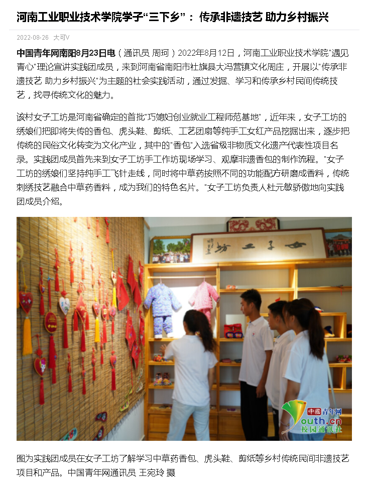 图为中青网专题报道河南工业职业技术学院“三下乡”社会实践活动