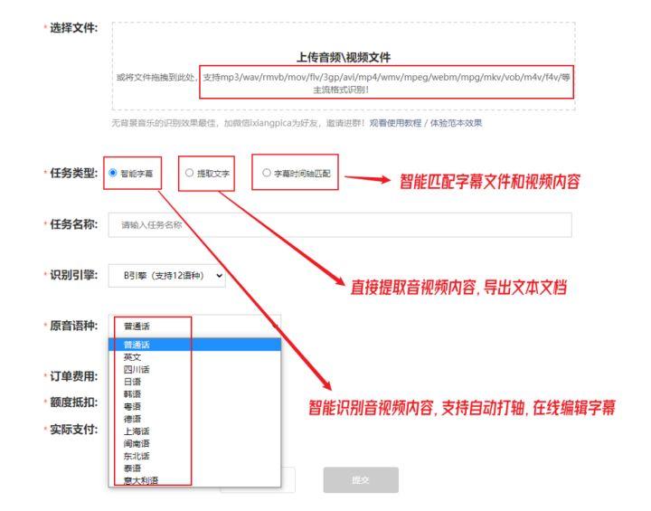 在上传视频时,提供有3种任务类型,16种音视频格式,12种识别语言: