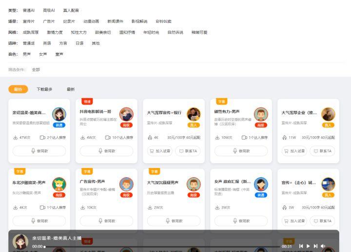 除了影视解说类的声音,网站内还有宣传片音、广告片音、纪录片音、动漫动画音、新闻课件音、彩铃叫卖音.....听起来都很自然。