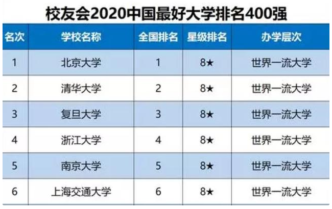 在校友会发布的2020年中国最好大学排行榜中,北京大学、清华大学获评8星级,位列内地高校前两位;前六位均为清北和“华五”高校,复旦大学超越浙江大学位列第三,南京大学和上海交通大学分别位于第五位和第六位。