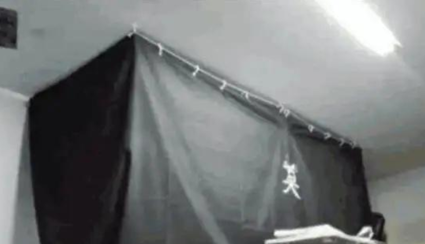 这位同学将整个床铺用黑色围了起来,颜色很单调,尤其是一个“奠”字十分显眼,这位的风格估计连辅导员老师都要害怕了,真是让人难以接受。