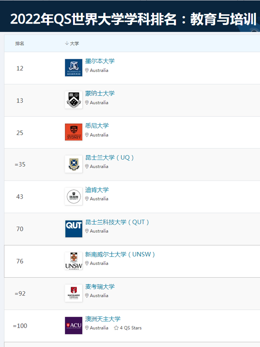 除了迪肯大学之外,在澳大利亚其他非八大院校之中,昆士兰科技大学、麦考瑞大学、澳大利亚天主教大学都位列2022QS教育与培训专业排名100强,不仅教学质量有保障,录取条件和学费都要低于澳洲八大,性价比相当高。