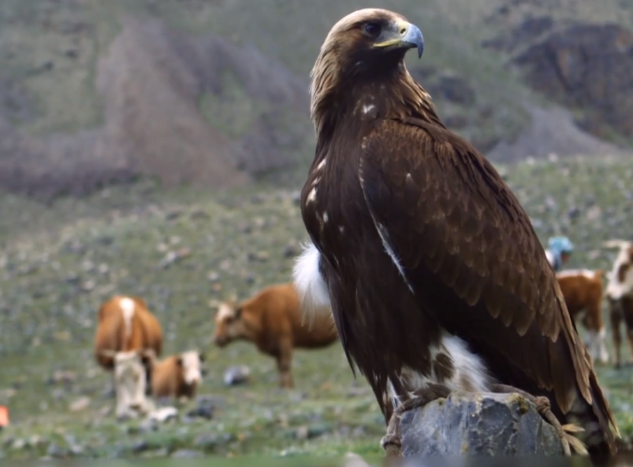 当父亲从山上把老鹰放开时,它听着艾索潘的呼唤,立马锁定了远方的猎物,并以迅雷不及掩耳之势向山下冲去。