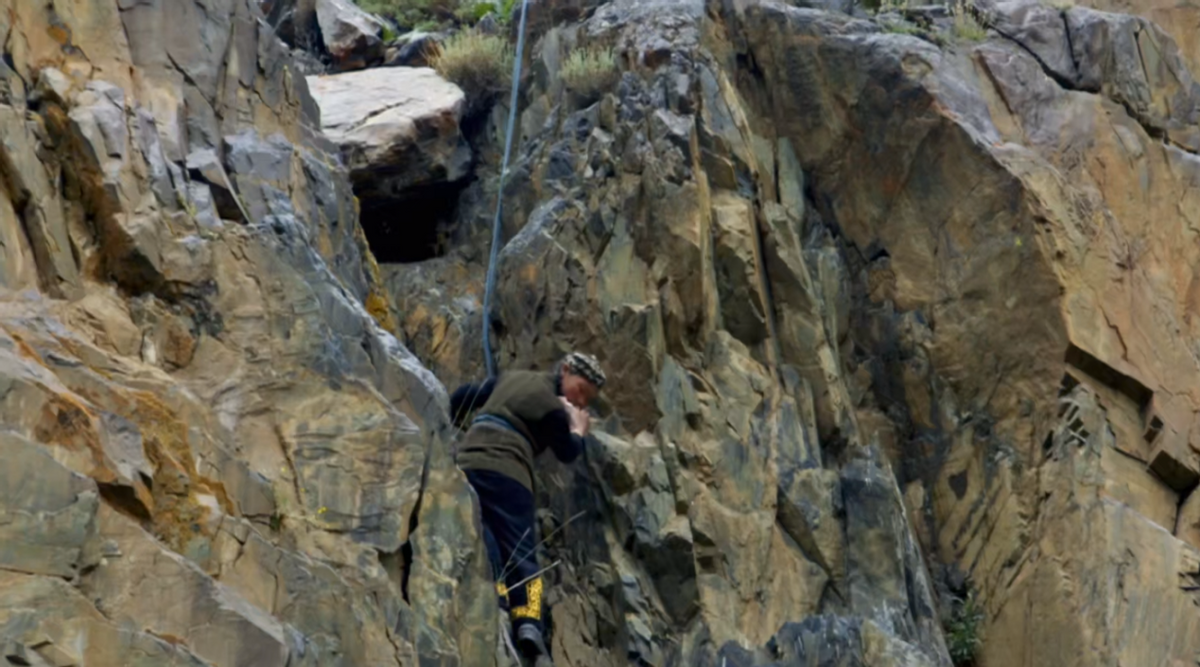 鹰巢很高,从下面根本爬不上去,必须绕到山顶上借助绳索下去,这对艾索潘来说是非常大的挑战。