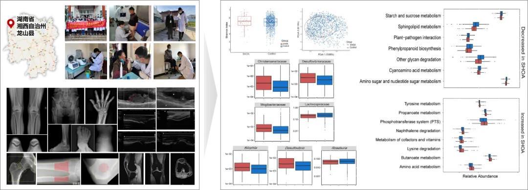 ▲建成我国骨关节炎领域首个自然人群队列(Xiangya Osteoarthritis Study),属全球骨关节炎领域唯一拥有多组学数据(微生物组、代谢组、基因组、影像组)的自然人群队列,明确肠道菌群紊乱等多种国人骨关节炎重要危险因素。