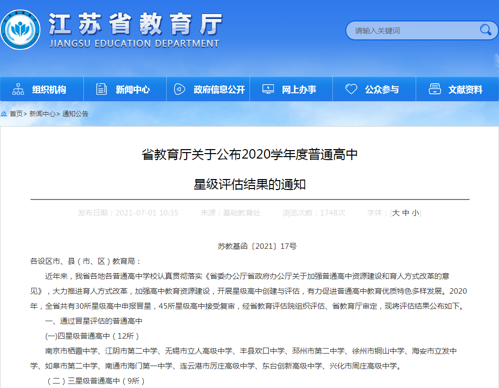 江苏省教育厅公布了