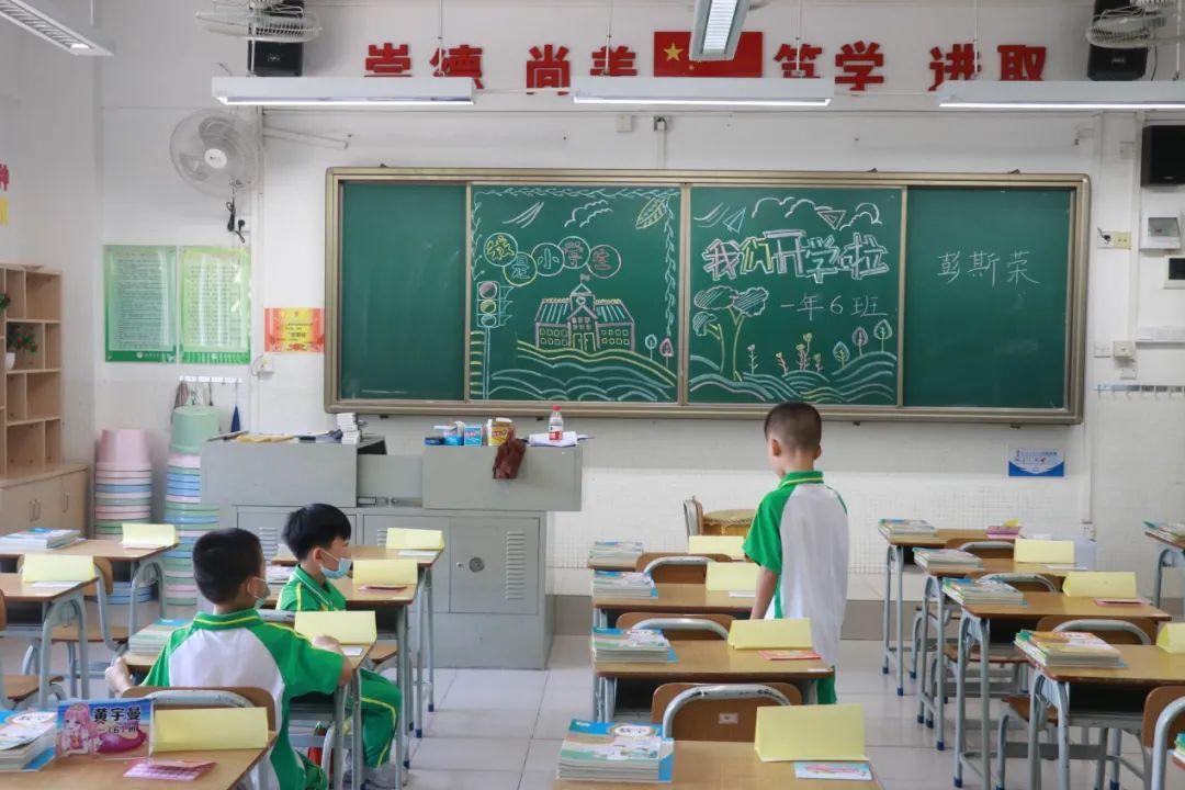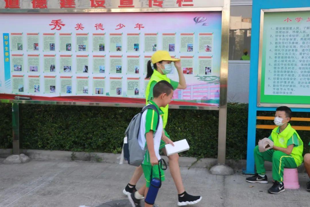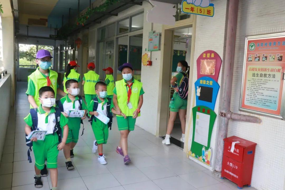 为了让一年级的新生能够顺利、快速地找到对应的教室,毓秀小学做了一个贴心的安排——“以大带小”,安排高年级的学生在校门口将一年级的新学带到“测温处”测试体温,随后一一将他们带领到对应的课室,亲手将他们交到班主任手中。