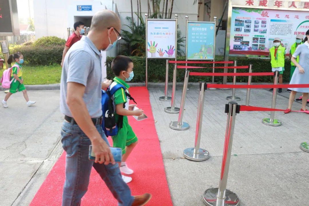 7:30还未到,一年级的新生已经在父母的陪伴下,陆陆续续来到的校门口,由于今年疫情的原因,为了全体师生的卫生安全,家长只能将孩子送到校门口,入校后由“老生”护送。