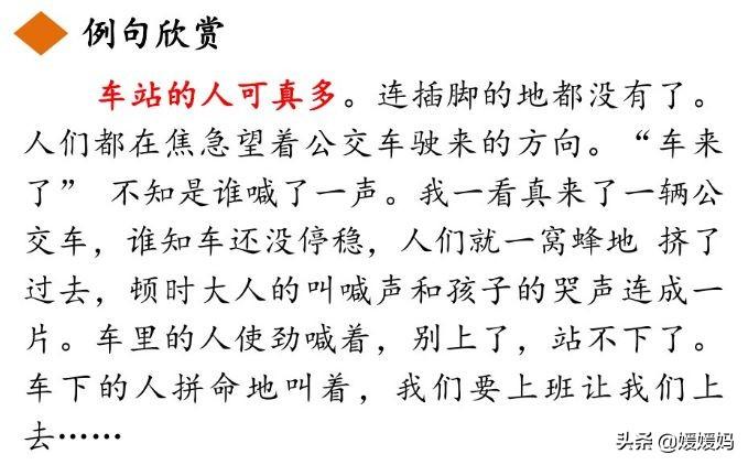 示例:老师是刚调来的,还不知道我的情况。一天,老师让同学们轮流上讲台讲故事。同学们一个个都讲出了自己的故事,我却没有心思听,眼看要轮到我了,我的手心竟紧张得蒙上了一层细密的汗珠。终于还是轮到我了,全班同学的目光一齐投向了这个角落,我立刻把头低了下去,强忍着不让眼泪掉下来。