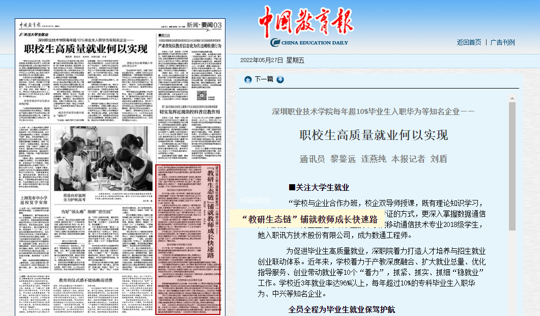 据中国教育报报道,深职院着力打造人才培养与招生就业创业联动体系。近年来,学校着力于产教深度融合、扩大就业总量、优化指导服务、创业带动就业等10个“着力”,抓紧、抓实、抓细“稳就业”工作。学校近3年就业率达96%以上,每年超过10%的专科毕业生入职华为、中兴等知名企业。