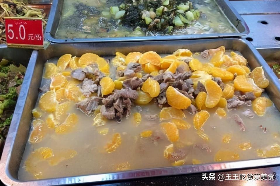 排骨一直是被称为硬菜,在酒席上被称为压轴菜品,一般常见的做法就是红烧,清炖或者炖汤喝,但是你吃过橘子炖排骨吗?橘子酸甜的口感,富含丰富的维生素,有清热去火的效果,而且又以排骨搭配,两者融合在一起,成了焦点。酸甜的口感,加上排骨的鲜香,相信味道应该还不错,而且这价格还很实惠,5元一份,我们还有什么理由拒绝呢?哈哈。