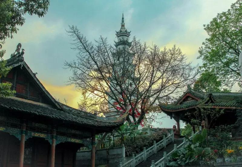 白塔寺始建于隋代,位于崇州市道明镇,紧挨着白塔湖。湖水三面环山,寺内白塔雄姿挺拔,如柱擎天,矗立山顶。