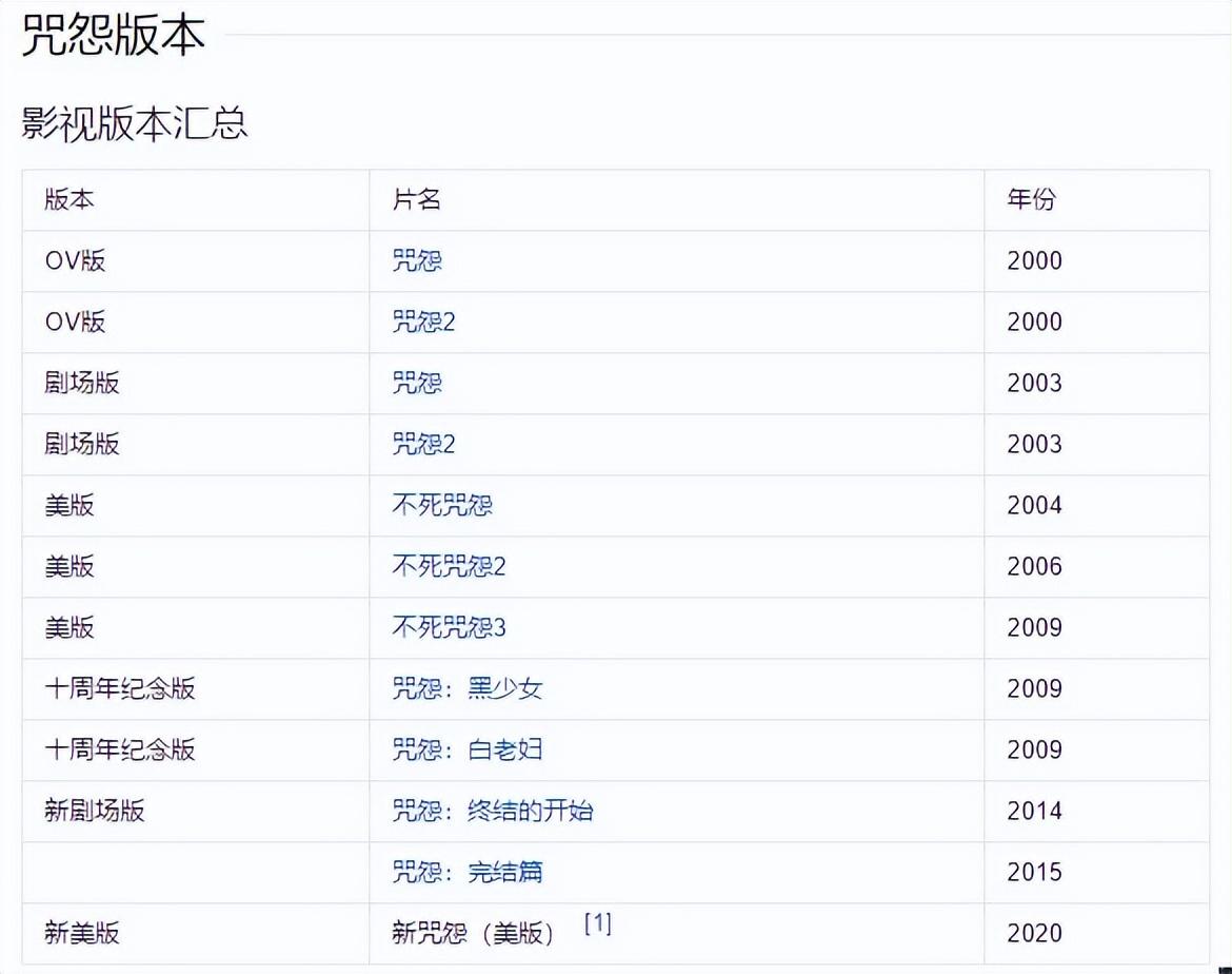 《咒怨》是日本作家大石圭写的小说,后被翻拍成为系列电影,历经20年出现了很多版本包括日本TV版两部、剧场版两部、纪念版两部、新剧场版两部和美国版三部以及20年的新美版一部,其中剧场版应该是我们这一代人最熟知的版本。