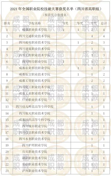 根据2021年全国职业院校技能大赛高职组获奖名单统计,四川省高职院校共获奖39项,获得一等奖的四川高职高专院校共2所、二等奖共4所、三等奖共23所。