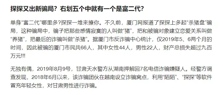 据厦门反诈骗中心统计,仅两个月时间就有66个受害者因为探探上的“杀猪盘”被骗了超过900万元;