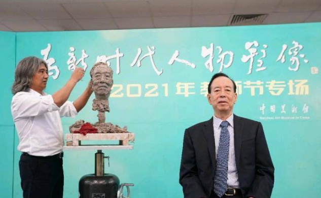 9月9日,中国美术馆馆长吴为山(左)为“全国教书育人楷模”代表郝跃塑像