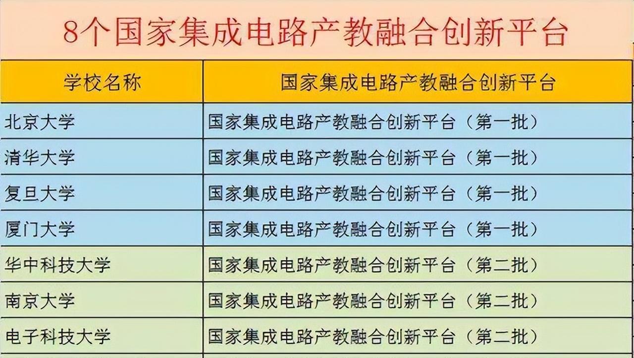 国家集成电路产教融合创新平台包含了8所高校:第一批四所:清华大学、北京大学、复旦大学以及厦门大学;第二批四所:华中科技大学、南京大学、电子科技大学以及西安电子科技大学。