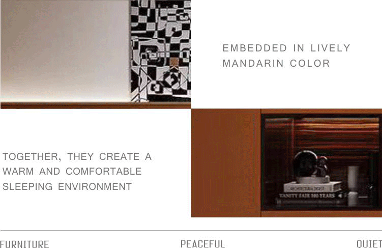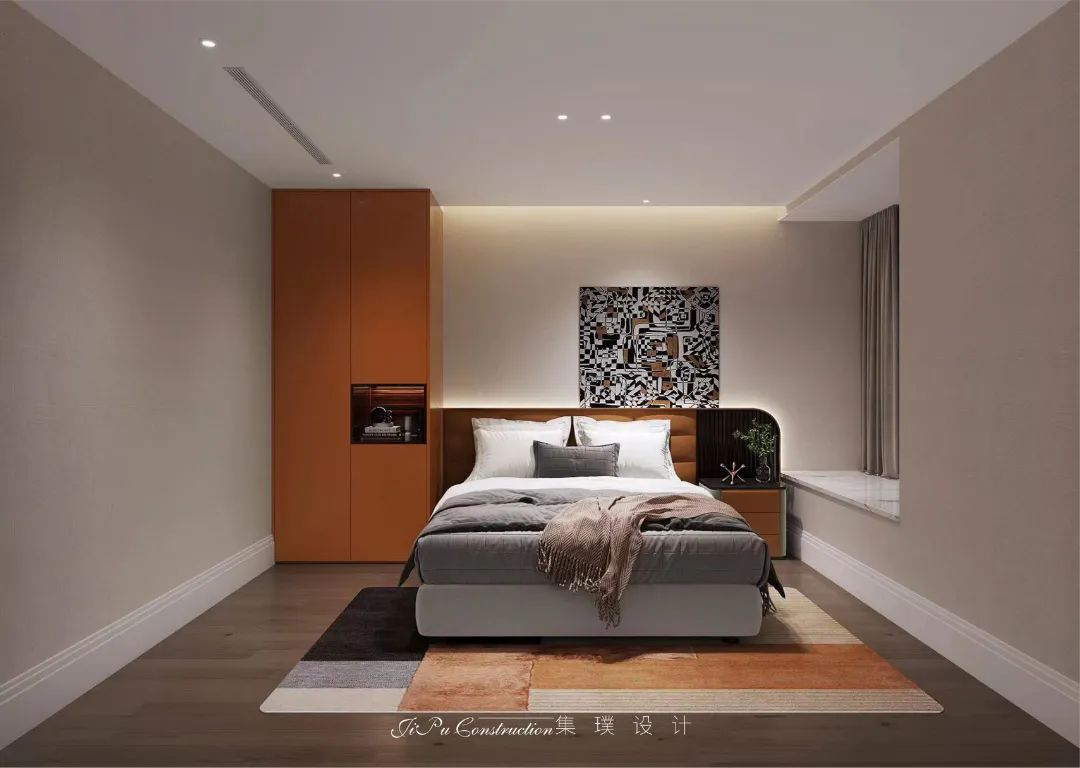 温暖是客卧给人的第一感受,空间以暖色调为主。嵌入活泼的蜜柑色辅以木质家具搭配,体现出空间层次,共同营造出一个温馨舒适的睡眠环境。