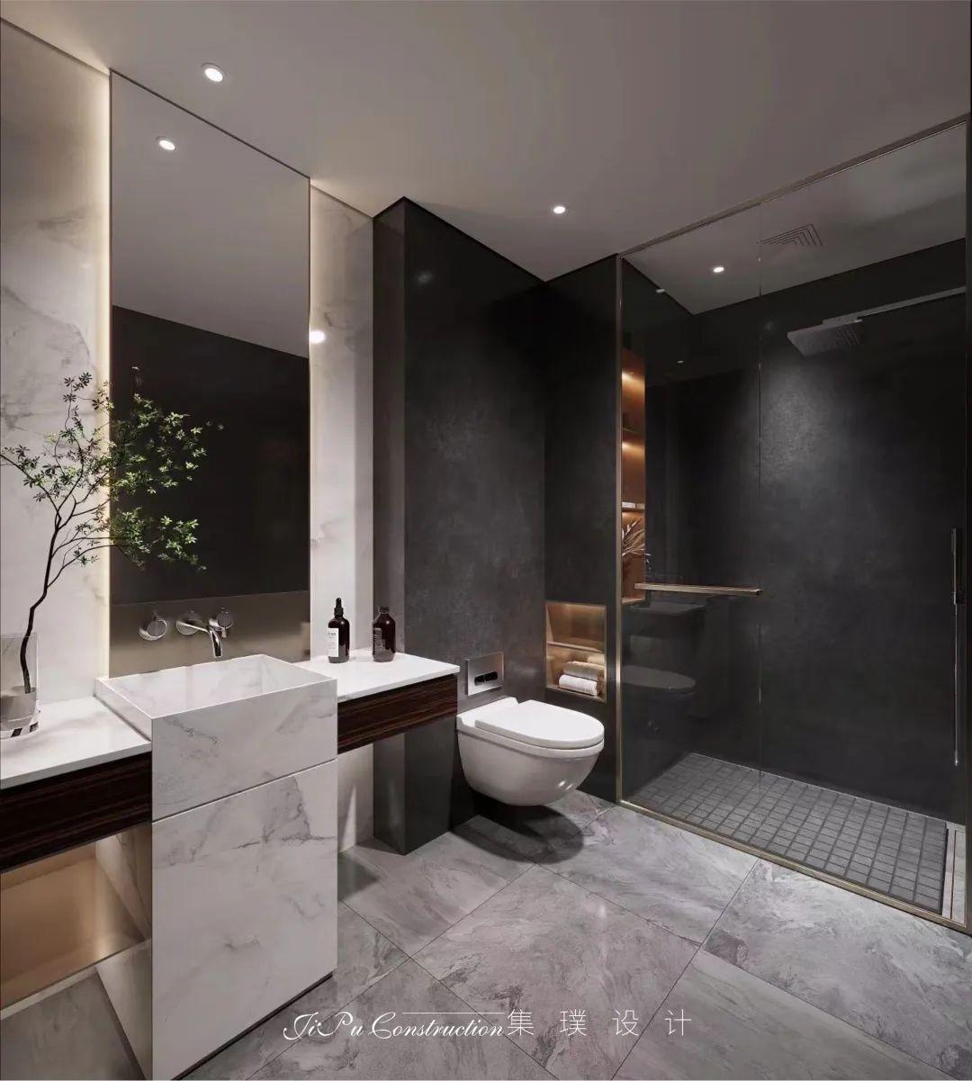 墙面、地面统一的灰色大理石,干湿分离的设计,保证了日常使用时的舒适度。采用悬空浴室柜及台上盆,没有卫生死角精致与整洁兼容并蓄。