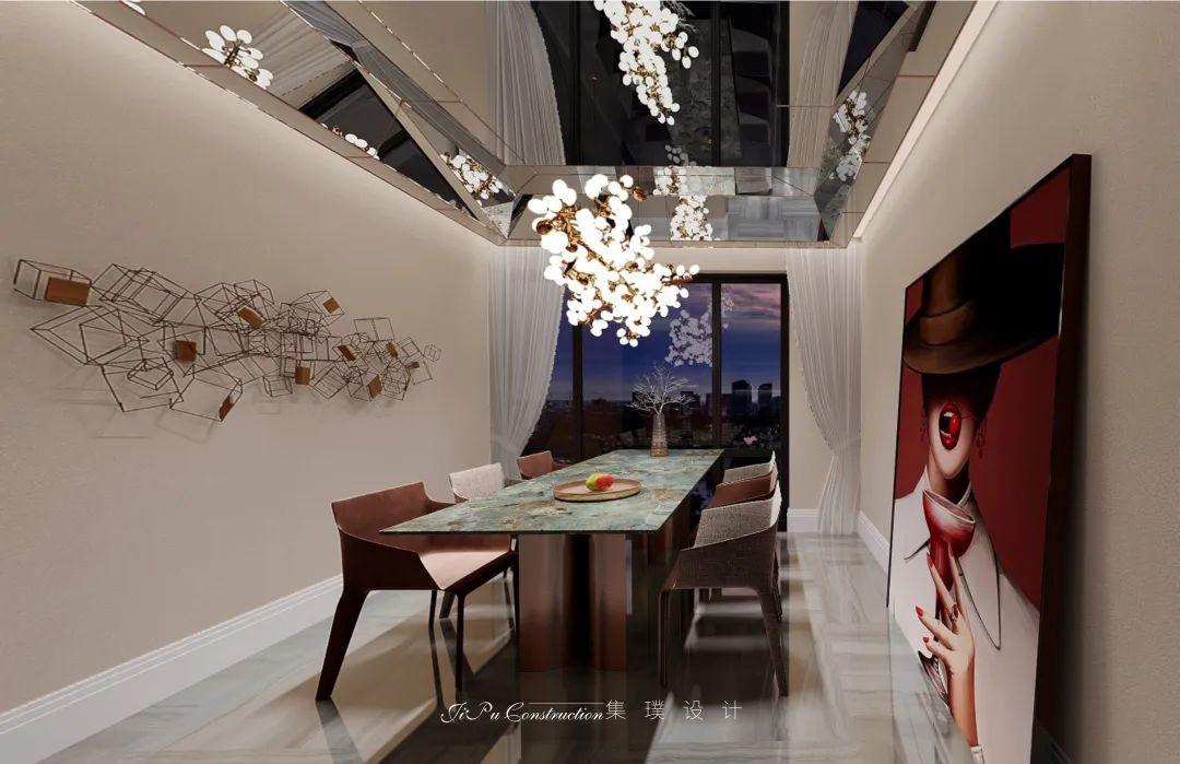 餐厅桌椅干脆利落,一盏浪漫主义情调的金属吊灯从上而下;在顶面反光材质的映衬下,极具视觉冲击力。