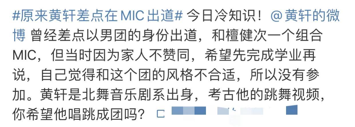 值得一提的是,知名演员黄轩也曾有幸成为“M.I.C男团”的一员。但黄轩觉得其外在条件实在与M.I.C男团不符。