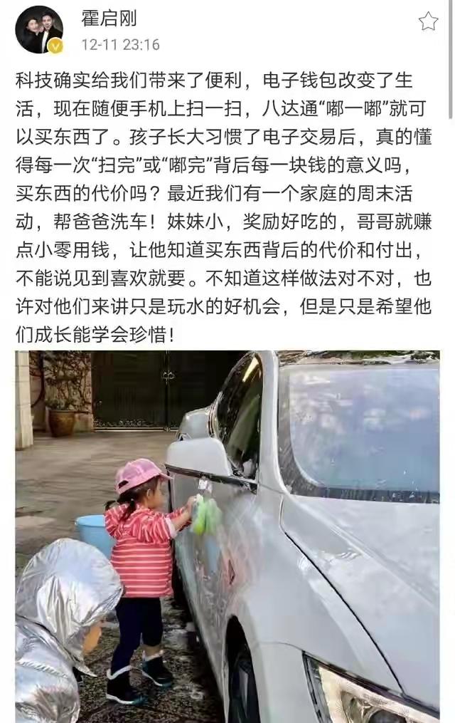 霍启刚也不从不娇惯孩子,他晒出让儿子和女儿一起去擦车,通过擦车来赚钱。