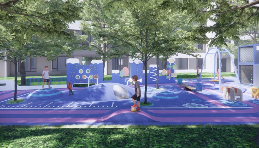 社区内还规划了全龄乐活空间,有羽毛球场、约750米的健康跑道、多功能活动区,为儿童和老人分别打造了儿童游乐场所、健身康体中心。