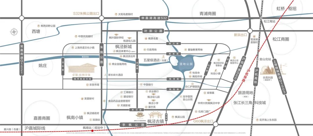 世纪金源·梧桐印象地处金山枫泾,距离枫泾古镇约1.8公里,区位优势明显。不少人对枫泾都有着一个刻板印象:偏远,但其实枫泾的规划、交通、资源远比想象中的更可圈可点: