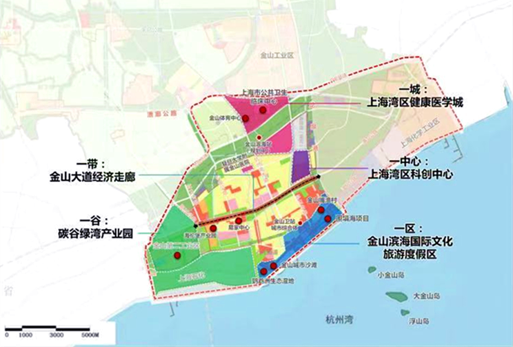 在虹桥国际开放枢纽中,南向拓展带上,对接杭州湾的正是金山!