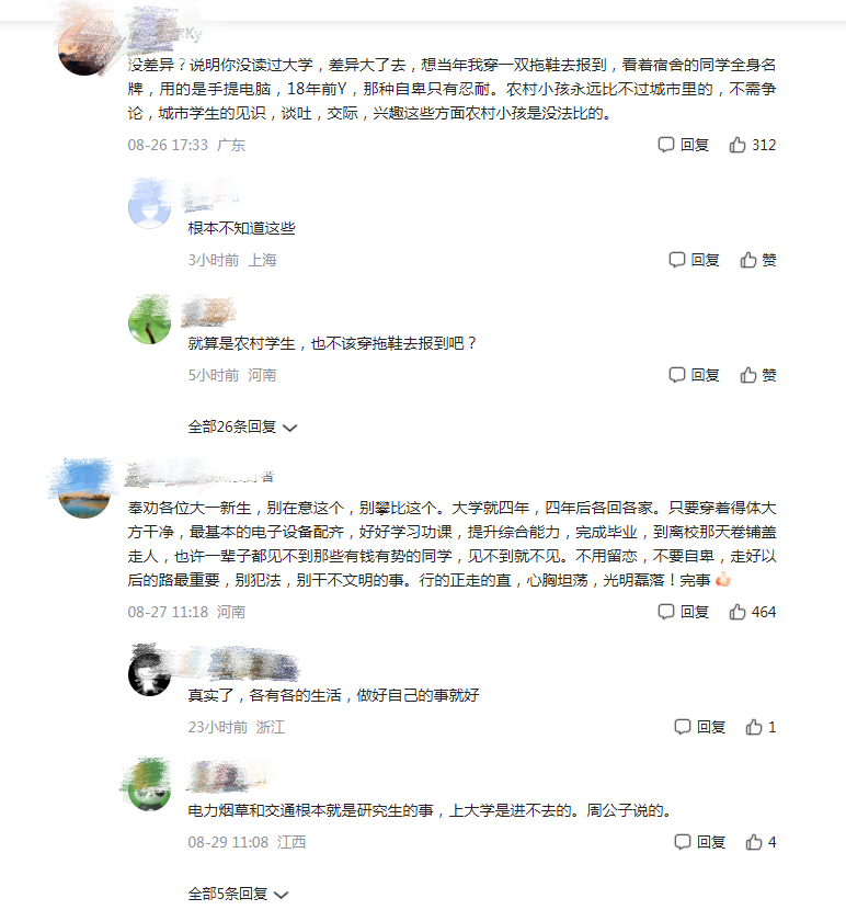 来到大学以后,学长看到了同时来报到的同学们。他自己为了省钱,所以是跟家里人坐着绿皮火车来的,同学们则有些坐飞机有些高铁过来的。坐飞机在他的认知里,是一个只有等工作以后才有机会尝试的事情。