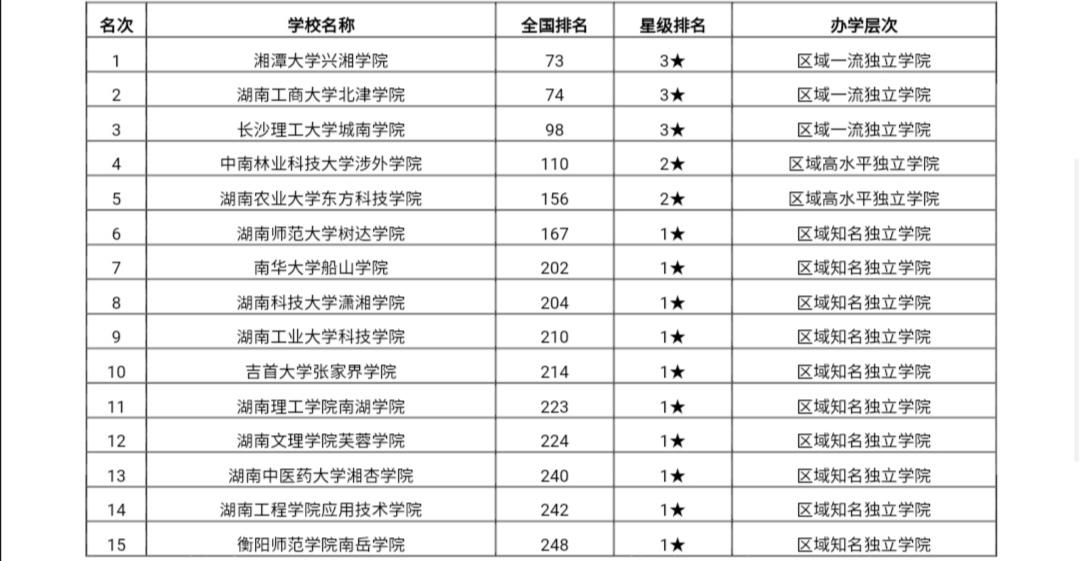 独立学院有15所,前三名都是区域一流独立学院,湘潭大学兴湘学院、湖南工商大学北津学院位列一二,全国排名是73、74名;长沙理工大学城南学院位列第三,全国排名98,三所学校都位居全国前100强。