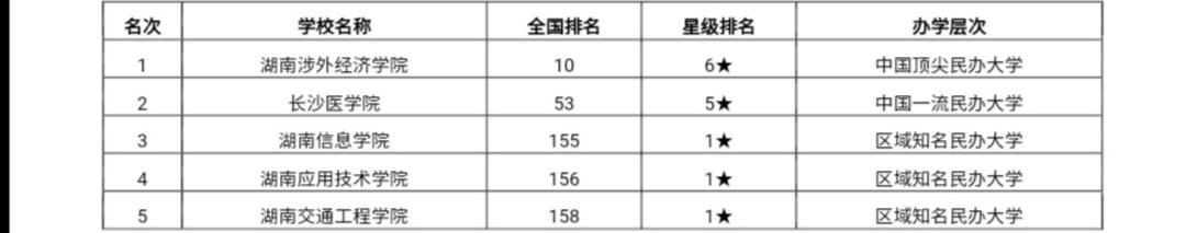 湖南省有民办大学5所,排名第一的是湖南涉外经济,全国排名第10,是中国顶尖民办大学;第二名长沙医学院,全国排名53,是中国一流民办大学;第三名是湖南信息学院,全国排名155位,是区域知名民办大学。