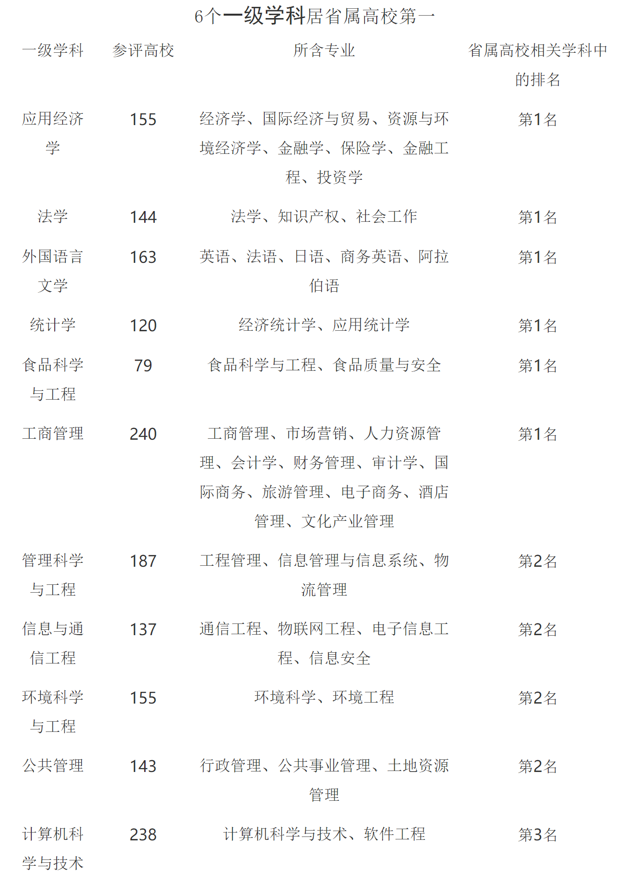 上面主要是学位点建设情况,如果从学科评估结果看,在全国第四轮学科评估结果中, 该校统计学进入 A 类学科,工商管理、应用经济学、外国语言文学、食品科学与工程、法 学和计算机科学与技术 6 个学科进入 B 类。浙江工商大学校园网统计,一共有6个一级学科位居省属高校第一,并且给出了对应的专业。这对于大家理解各个学科,以及浙江工商大学的优势特设专业有不小的帮助。