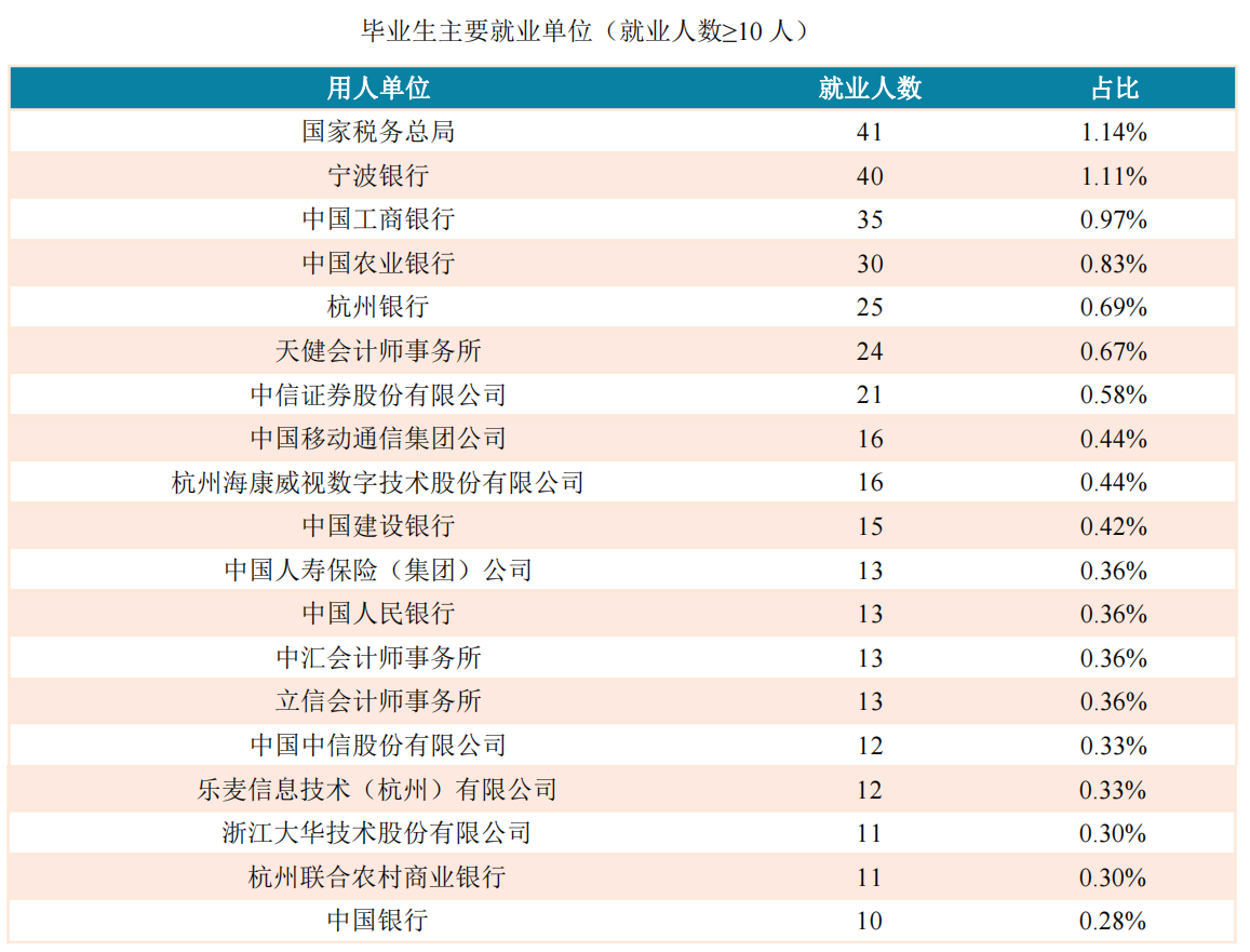 根据毕业生就业指导报告,浙江工商大学毕业生就业集中度相对较高,主要集中在金融、会计、信息技术服务类企业。部分主 要就业单位如下表所示: