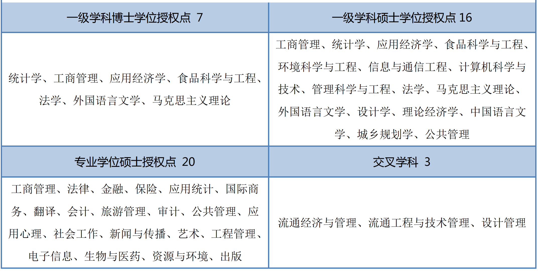 对于一所高校来说,发展成绩的重要体现就是学科建设情况。具体到浙江工商大学来说,截至2021 年底,该校有 7 个一级学科博士学位授权点、16个一级学科硕士学位授权点、20个硕士专业学位门类(覆盖26个招生领域)、3 个交叉学科学位授权点。