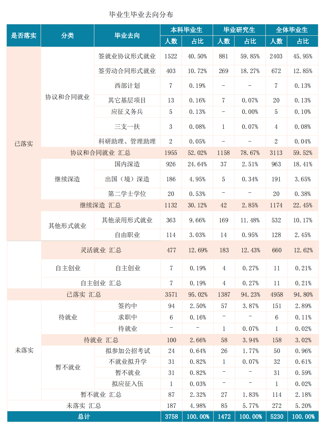 本科毕业生毕业去向落实 3571 人,落实率为 95.02%,主要毕业去向为:签就业协议形式就业(占比 40.50%)、继 续深造(占比 30.12%)、签劳动合同形式就业(占比 10.72%)。
