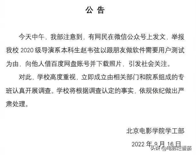 9月16日,某网友发表了一篇名为《借出百度账号后,我被陌生人“嫖”了》的文章,实名举报北电20届学生赵韦弦多次以借账号为由,盗取女孩的私密照片。
